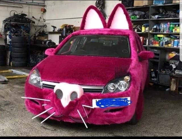 18. This person turned their car into a pink, fuzzy cat, complete with whiskers and ears